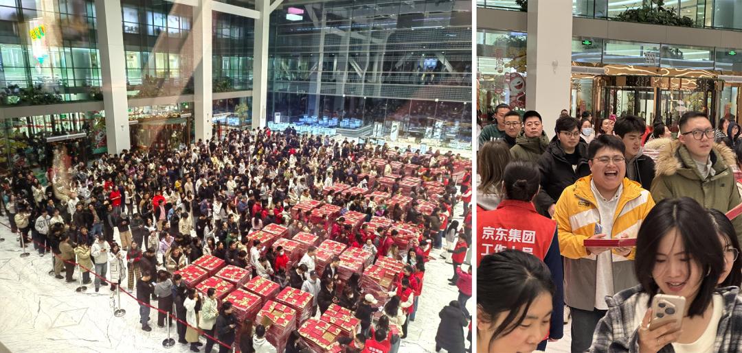 就在前几天,10万份巧克力抵达京东多地职场。于是,打工人上班暂停,穿过连通各栋办公楼的室内连廊,提前走进了新年的氛围里。