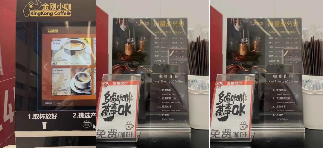 午饭后一杯咖啡向来是职场人的刚需。所以,园区各楼层都配有免费的咖啡机,由公司承担所有费用,一共有好几百个,每层楼都有俩,甚至贴心标出了热量信息,对减脂人士格外友好。